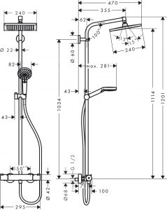 - Longueur bras de douche env. 350 mm,