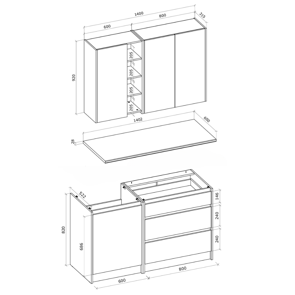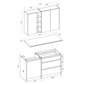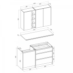 La cuisine Zlata 1,4m est livrée avec TOUS les éléments essentiels : armoires basses avec tiroirs, meuble évier, armoires murales généreuses et plan de travail 140cm inclus. Une solution clé en main pour moderniser votre cuisine compacte.
