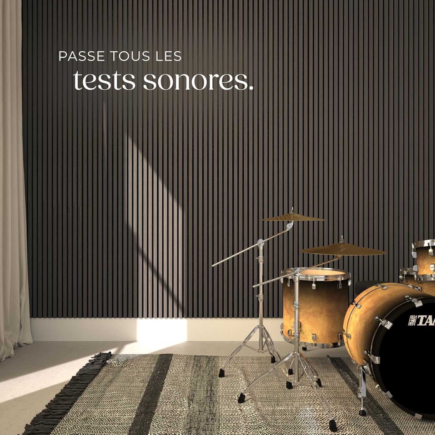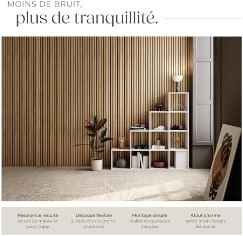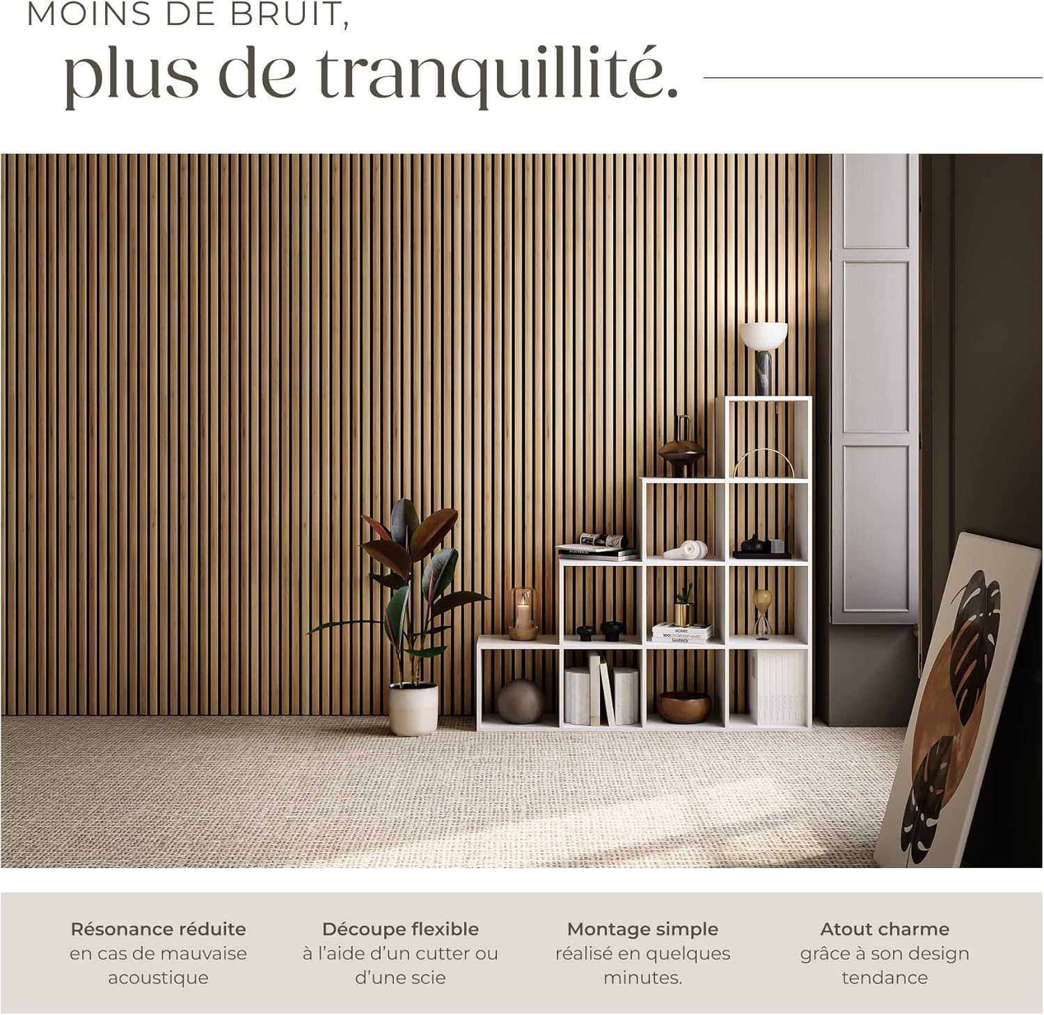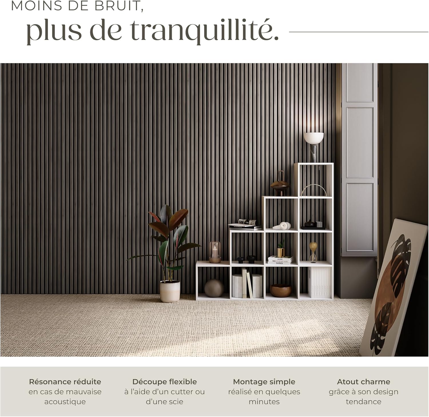 Avec ces panneaux acoustiques, vous bénéficiez d’une réduction significative de la réverbération gênante, ce qui se traduit par une atmosphère plus agréable et plus productive. Que ce soit pour votre bureau à domicile, votre salon ou votre salle de musique, les panneaux acoustiques offrent une solution flexible et élégante à vos problèmes acoustiques. Une combinaison innovante de lamelles et de feutre permet d’absorber efficacement les sons indésirables.