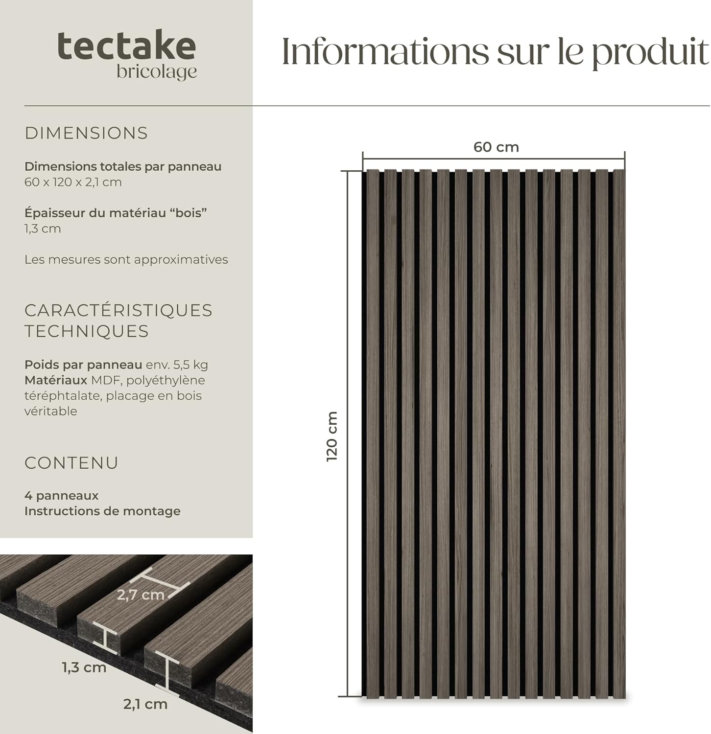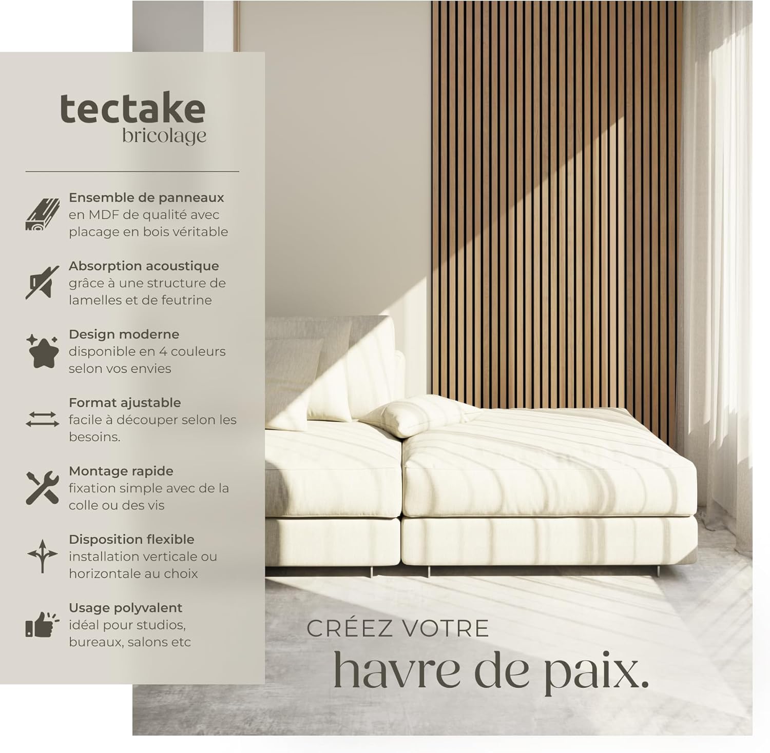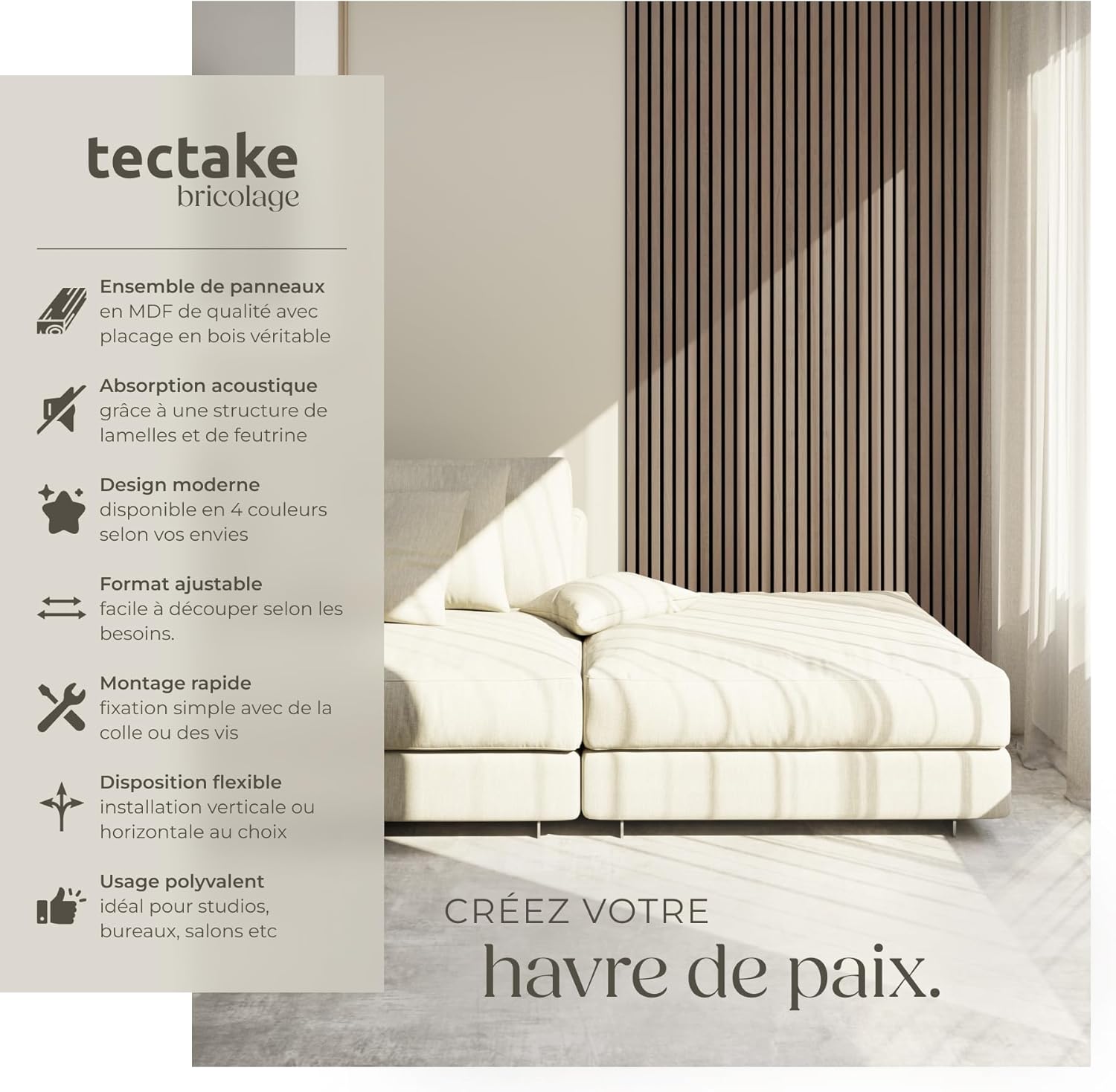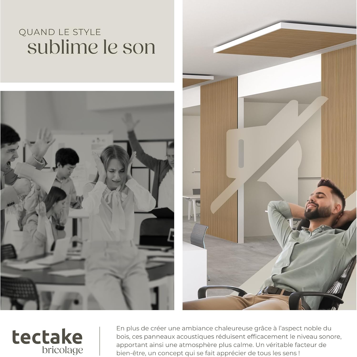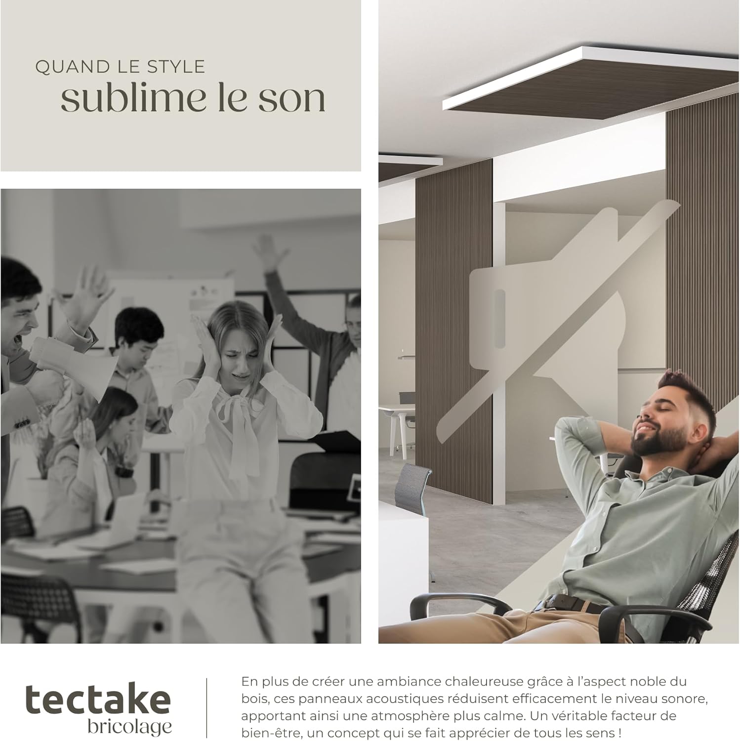 Découvrez le lot de 2 panneaux acoustiques Sonic Wall de tectake : la solution parfaite pour optimiser vos espaces de vie ou de travail non seulement sur le plan acoustique, mais aussi sur le plan visuel. Ces panneaux acoustiques de haute qualité en MDF et placage de bois véritable sont d’une part efficaces en matière d’absorption acoustique et s’intègrent d’autre part harmonieusement dans chaque environnement grâce à leur design moderne.