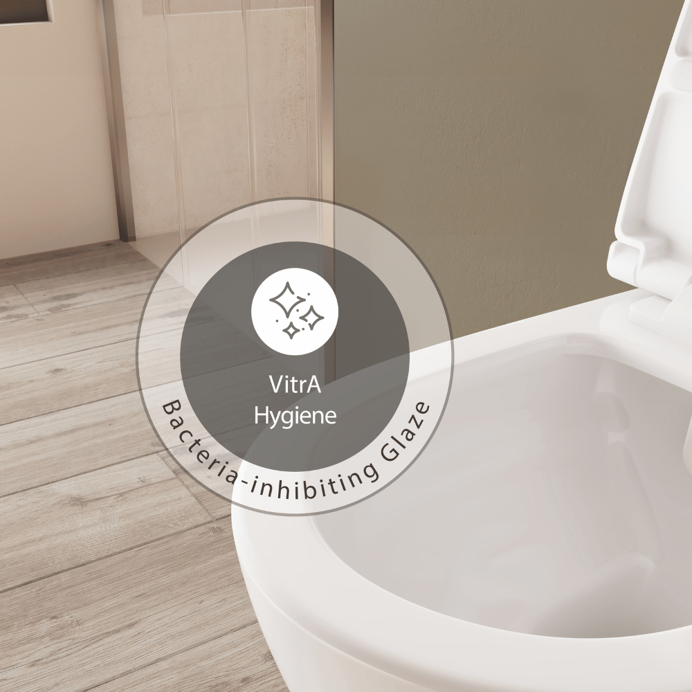 - Hygiène renforcée : Cuvette réalisée en émail exclusif VitrA Hygiene, détruisant 99,9 % des germes pour une propreté durable, non polluante et facile à entretenir.